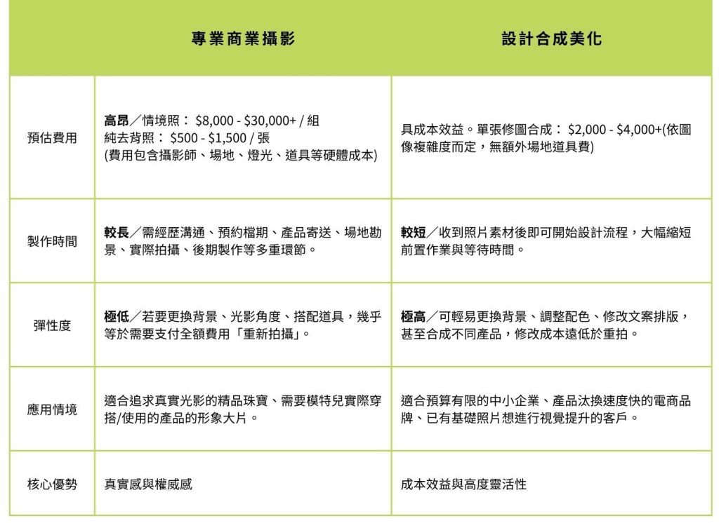 商業攝影 vs. 設計合成美化 費用與效益比較表